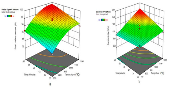 The fit statistics for the model of conductivity specify 79.88% adjusted R2. The adequate precision ratio was 13.28 implying that the model had a high signal-to-noise ratio, which qualified it to navigate the design space. The relationship between conductivity with carbonized time and temperature is shown in Figure 2b. The optimum value of the fixed carbon content with the desirability of 0.585 was 91.156% carbonizing the wood at a temperature of 928 °C and 37 min; this gives an electrical conductivity of 463.34 Sm−1 of charcoal compared to the immeasurable conductivity of wood.