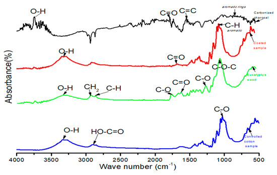 Infrared spectra of eucalyptus wood, charcoal, charcoal coted and controlled samples.