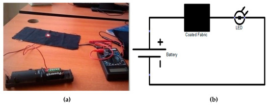 For corroboration conductivity, a light-emitting diode was lit up by powering a charcoal coated cotton textile with a DC power supply verifying that charcoal coated cotton fabric was electrically conductive, as shown in Figure 8.