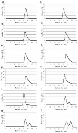 In Figure 1a–f, a single peak occurs with the maximum at 40–50 nm (specimens containing 0.02–0.7% nanoparticles). However, in Figure 1g,h, a transition occurs at the particle size of approximately 50 nm (1, 1.5%). At a higher nanoparticle content, a clear secondary peak occurs in the specimens modified with 2 and over 2% nanoparticles (Figure 1i–l). The secondary peak, which occurs beyond the particle size of 50 nm, becomes dominant in the specimen modified with 5% nanoparticles. This phenomenon suggests that an increase of nanoparticle content in the liquid phase increases the appearance of agglomeration as well, causing the occurrence of larger agglomerates in the nanocomposite material.