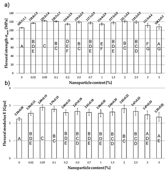 The nanoparticle content influence on flexural strength (a) and flexural modulus (b) of the unmodified and modified PMMA specimens. Letters indicate the statistical difference between specimens, whereby common letters indicate statistically insignificant differences.
