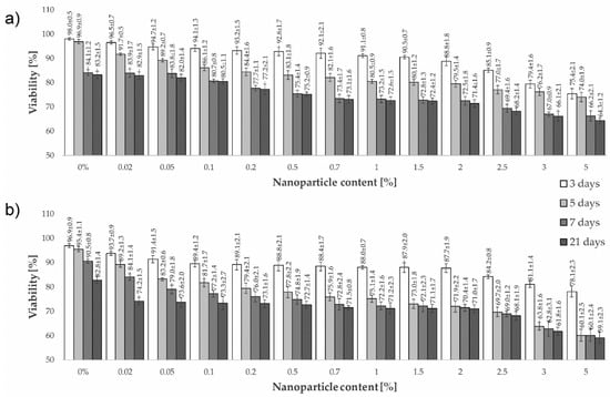 The influence of nanoparticle content and days of elution of the viability of L929 mouse fibroblasts and MRC 5 human lung fibroblasts is presented in Figure 4. Viabilities are the highest in specimens after the shortest time of elution. The lowest cytotoxicity (the highest viability) was obtained in unmodified specimens (0%), while standard deviations are the lowest in these specimens as well. This is a similar trend to mechanical properties, where standard deviations were obtained in the specimens containing nanoparticles.