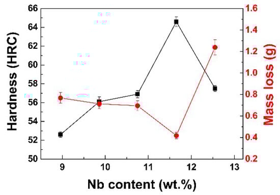 Rockwell hardness and mass loss (during wear testing) plotted as a function of the Nb contents of the coatings.