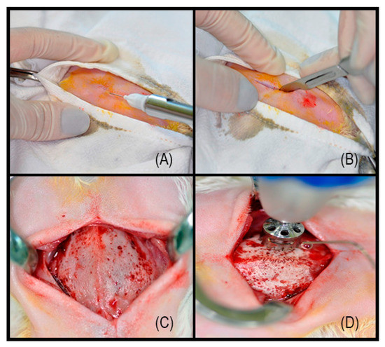 (A) Local anesthetic; (B) Linear incision, 5 cm long; (C) Parietal bone exposed; (D) Trephine bur with 8 mm diameter used to create the defect.