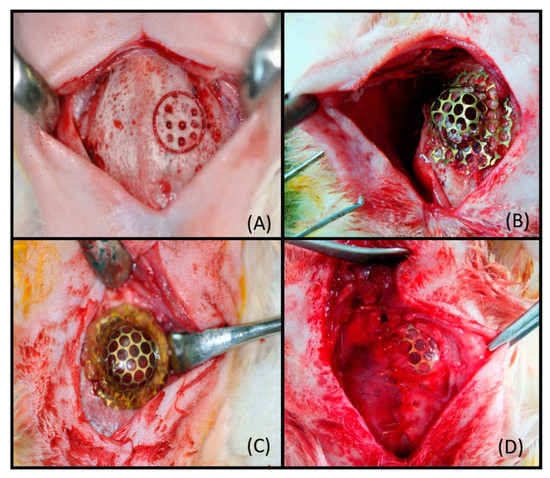 The domes (with and without latex coating) were fixed above the defect using Cyanoacrylate adhesive (Figure 3B,C). The animals were divided in 4 groups: Group 1, the control group (N = 6), received the defects treated with the titanium dome mesh, and this dome was not covered by periosteum; Group 2 (N = 6) received the defects treated with the titanium dome mesh, and this dome was covered by periosteum; Group 3 received the dome coated by latex, and this dome was not covered by periosteum; and Group 4 (N = 6) received the dome coated by latex, and this dome was covered by periosteum. (Figure 3D). Figure 3 shows the bone defect (Figure 3A) in the rabbit calvaria and the fixation of the dome (Figure 3B,C) during the surgical procedure. Animals from Groups 2 and 4 had the domes covered by the periosteum (Figure 3D).