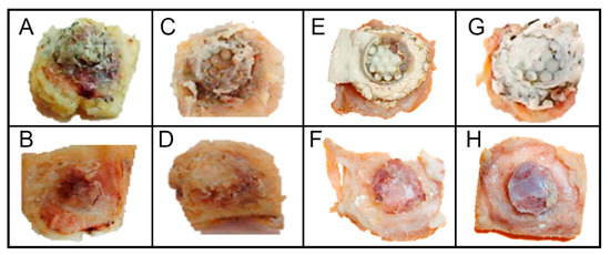 Photographs of the samples removed after 90 days of surgery. Photos of the pieces with the domes and after their removal, showing the difference obtained with the latex coating: Group 1 (A,B), Group 2 (C,D), Group 3 (E,F) and Group 4 (G,H).
