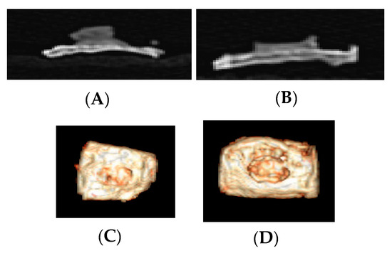 Tomographic images of Groups 3 (A,C) and 4 (B,D), where bone tissue beyond the skullcap can be observed.