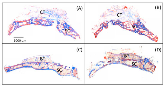 Figure 6 shows the photomicrography of all the groups for comparison. In these images, the pre-existing bone structure of the skullcap (SC) and the structure that was formed inside the dome can be seen. In Groups 3 and 4 (Figure 6C,D), in which the titanium mesh was covered with the latex layer, we verified bone tissue (BT) in the region of the dome, which grew above the skullcap. In Groups 1 and 2 (Figure 6A,B), we verified, predominantly, connective tissue (CT).