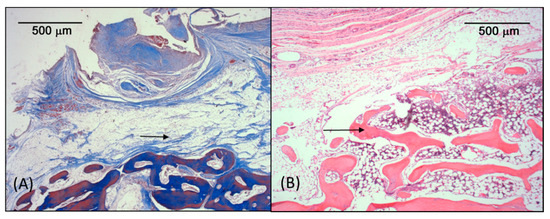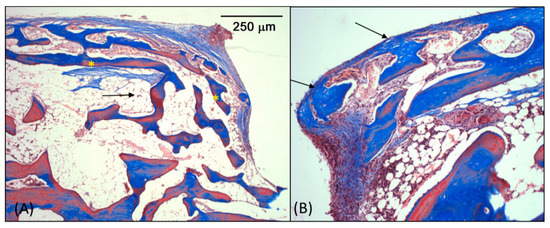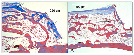 Microscopic images from Group 4: (A) Newly formed bone reaching the limits of the dome (black arrows). (B) Lamellar bone tissue dispersed within the dome.