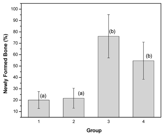 Histomorphometric analyses were performed by measuring the area of the newly formed bone inside the dome region. The results were converted into percentages (in relation to the total area) and are presented in Figure 11 as means ± SDs. The ANOVA (Origin version 8.5, OriginLab Corporation One, Northampton, MA, USA) followed by Tukey’s test was used for comparison between the groups. There were no statistically significant differences between Groups 1 and 2, or between Groups 3 and 4. The other comparisons showed significant differences (p < 0.05). The results are shown in Figure 11.