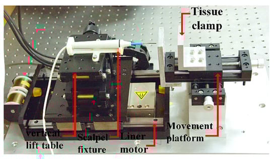 In order to prevent large deviations of the experimental results caused by manual cutting, a designed setup comprising of a tissue clamp, a vertical lift table, a sheet clamp, a linear motor module, a two-axis horizontal movement platform was utilized for electric cutting experiments, as shown in Figure 2. The electric cutting experiments were performed by using a minimally invasive electrosurgical device (LK-3, JIUJIAN Medical Equipment, Shenzhen, China). During the electric cutting experiments, the linear motor module (MLCJ-0040-075-00, Junxin, Shanghai, China) controlled by a Copley drive (ACJ-055-18, Copley, MA, USA) was utilized to realize translational motion.