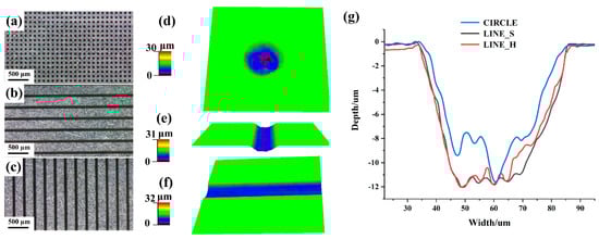 Three kinds of different micro-textures with an area density of 20% are shown in Figure 3a–c. Obviously, their distributions on the electrode surface are different under the same area density. The 3D enlarged images of micro-dimples, longitudinal micro-channels and lateral micro-channels are shown in Figure 3d–f, respectively. Different micro-morphologies of the three kinds of texture can be seen clearly. The comparison of cross-sectional profiles of these micro-textures is shown in Figure 3g. As can be seen, the sectional dimensions of all three kinds of micro-textures are almost the same. The width of micro-channels is 50 μm, and the depth is approximately 12 μm. The diameter and depth of micro-dimples are 50 and 12 μm, respectively.