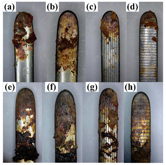 To investigate the effect of different morphologies of micro-textures on adhesion properties, electrode 1, electrode 2, electrode 3 and electrode 4 (i.e., electrode without micro-texture, electrode with micro-dimples, electrode with longitudinal micro-channels, and electrode with lateral micro-channels) were performed in electric cutting experiments. Take the images of electrode surfaces after the first and fourth electric cutting experiments as the example, as shown in Figure 4. It can be seen that the tissue adhesion on electrode 1 is the most serious. The charring tissue covered almost the entire surface of electrode 1 after four electric cutting experiments. Compared with electrode 1, tissue adhesion is slightly less on electrode 2. The tissue adhesion on the electrode with longitudinal micro-channels reduces significantly, and tissue adhesion on the electrode with lateral micro-channels is least among the four kinds of electrodes.