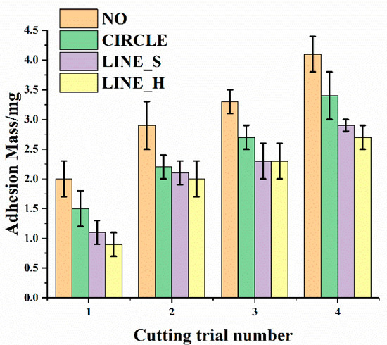 In order to further explore the adhesion behavior of different electrodes, the relationship between tissue adhesion mass and cutting trial number was investigated, as shown in Figure 5. It can be seen that the adhesion mass of all electrodes increases with the increasing of cutting trial number. After the first electric cutting experiment, tissue adhesion mass of electrode 1 reaches 2.0 mg, which is most of all. The adhesion mass of electrode 2 and electrode 3 is 1.5 and 1.1 mg, respectively. Tissue adhered to electrode 4 is least, and the adhesion mass is only 0.9 mg. Compared with electrode 1, the tissue adhesion mass of electrode 2, electrode 3 and electrode 4 decreases by 25%, 45%, 55%, respectively. After the fourth cutting experiment, adhesion mass of electrode 1, electrode 2, electrode 3 and electrode 4 is 4.1, 3.4, 2.9, and 2.7 mg, respectively. The tissue adhesion mass of electrode 2, electrode 3 and electrode 4 decreases by 20%, 29% and 34%, respectively. It can be seen from the experimental results that micro-textures play a crucial role in improving the adhesion properties of electrodes. Among the textured electrodes, lateral micro-channels exhibit the most effective anti-adhesion property.