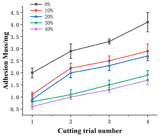 The relationship between adhesion mass and area density was investigated, as shown in Figure 7. Repeated experiments were still performed. The experimental results show that the adhesion mass increases as the cutting times increase. After the first electric cutting experiment, the adhesion mass of electrode 5, electrode 4, electrode 6 and electrode 7 is 1.1, 0.9, 0.8, 0.6 mg, respectively. Compared with electrode 1, the adhesion mass decreases by 45%, 55%, 60% and 70%, respectively. After four electric cutting experiments, the adhesion mass of electrode 5 is the most among the four electrodes, which is 2.9 mg. The adhesion mass of electrode 6 and electrode 7 is similar, which is 1.9 and 1.7 mg, respectively. Compared with electrode 1, the adhesion mass of electrode 5, electrode 4, electrode 6 and electrode 7 decreases by 29%, 34%, 54%, 59%, respectively. Thus, it can be seen that the better anti-adhesion property can be obtained when the surface micro-textures with larger area density are created.