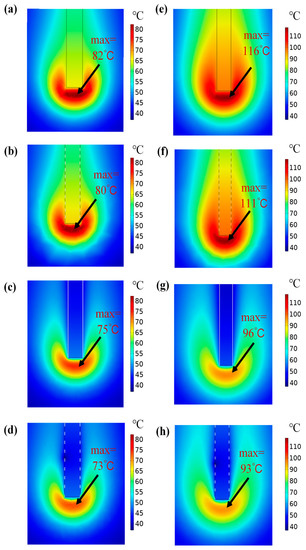 A finite element model was built to simulate the temperature distribution of the liver tissue in the electrical cutting process. Temperature distributions of the liver tissue for electrode 1, electrode 2, electrode 3 and electrode 4 at 1 and 3 s are shown in Figure 8. The finite element analysis results show that the area near the tip of the electrode can reach a higher temperature than the rest, thus causing more serious thermal damage and soft tissue adhesion. It can be seen from Figure 4a–d that the soft tissue adhesion on the electrode is mainly distributed near the curved area after the first electric cutting experiment, which is consistent with the simulation results. The temperature in the area of soft tissue which in contact with the electrode all increases with time, but the temperature in tissue cut by electrode 1 is higher than the others. The temperature in the soft tissue cut by electrode 1 is 82 °C at 1 s, which is the highest of all. The temperature in tissue cut by electrode 2 is 80 °C, and the temperature in tissue cut by electrode 3 is 75 °C. The temperature cut by electrode 4 is 73 °C, which is the lowest of all at 1 s. Compared with the others, the temperature of tissue cut by electrode 1 increases most rapidly, and the highest temperature reaches 116 °C at 3 s, as can be seen in Figure 8e. However, the lowest temperature in Figure 8h) is only 93 °C. Also, it can be seen that the temperature distribution is most concentrated in soft tissue cut by electrode 1. Compared with the temperature distribution in tissue cut by electrode 1, the center of the temperature field has a slightly dispersed trend in tissue cut by electrode 2. For tissue cut by electrode 3 and electrode 4, the temperature distributions are obviously dispersed, and the temperature in tissue cut by electrode 4 is lower than that of electrode 3.