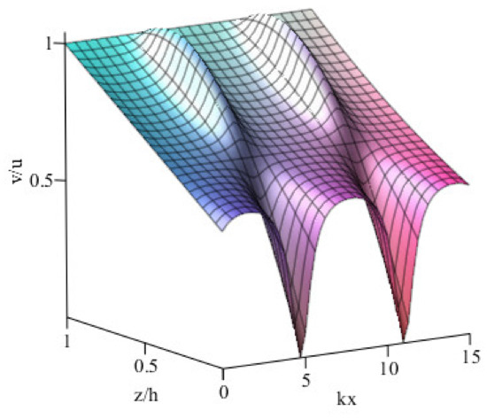 The relative tangential velocity vx/u at different height z/h for b/h = 1 + sin(kx).