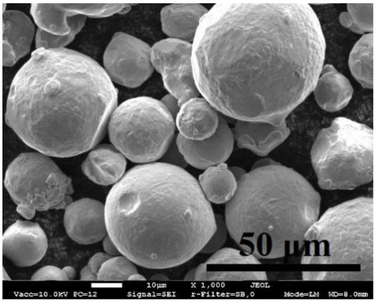 For a formation of the specimens, 1.2709 steel powder was used (0.03% C; <0.1% Si; <0.1% Mn; (17–19)% Ni; 4.8% Mo; <0.8% Ti; (8.5–9.5)% Co and <0.1% Al; Fe-balance). This steel also known as 18Ni300 maraging steel is one of the most widely used and commercially available maraging steels. The morphological analysis (from scanning electron microscope micrographs made using magnification from ×500 to ×3000, see cl. 2.4.) of the powder for selective laser melting showed that the size of particles varies between 7 and 30 μm. Particles of the powder are of near-spherical shape (Figure 1).
