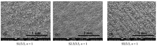 Figure 5 shows the morphologies obtained at various laser powers and scanning speeds. It was observed that most fine and uniform morphology is obtained applying 2.5 mm/s scanning speed (Figure 5b,e,h,k). The reduction of the scanning speed results in a formation of less uniform texture (Figure 5a,d,g,j), in which near spherical submicroscopic morphology of globules partially transformed into flower-like structure (Figure 5d). The increase in scanning speed led to a formation of coarser morphology (Figure 5c,f,i,l). At the same time, the variation of laser power has negligible effect on the surface morphology—very similar textures were observed at different powers and constant scanning speed.