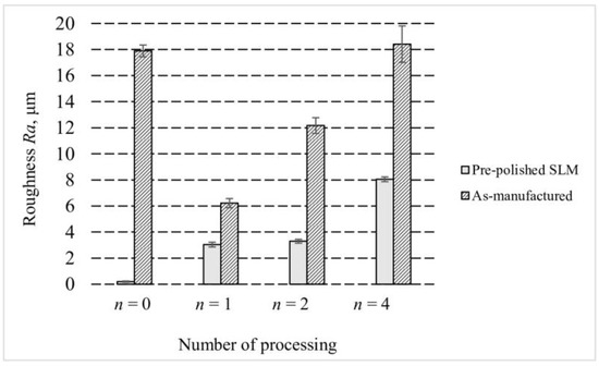 Figure 6 and Figure 7 present the results of roughness measurements. The roughness of the pre-polished surface increased after one-time laser processing (Figure 6). Repeated processing did not influence visibly the Ra parameter while after four-times processing Ra increased 2.7 times, what may be associated with the formation of coarser morphology. In the case of as-manufactured SLM surface processing, the roughness was reduced 3 times applying one-time processing (Figure 6). However, Ra parameter for as-manufactured surface after laser processing was 2 times bigger than that for pre-polished. This can be associated with the presence of residual undulation along with submicro-asperities of the texture. The formation of microcracks and their growth with the increase of processing number led to an increase in surface parameter Ra (Figure 6).