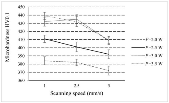 Hardness of specimens laser-processed at different laser scanning speeds and powers.
