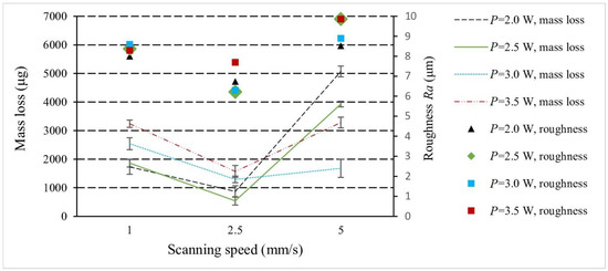 Mass loss under two body sliding wear and roughness of specimens laser-processed with different laser scanning speeds and powers.