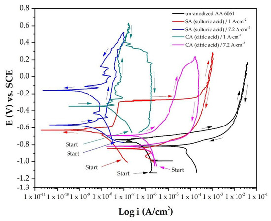- In this work, samples of AA 6061 were anodized in sulfuric acid and citric–sulfuric acid baths and exposed in a 3.5 wt.% NaCl solution. Their electrochemical behavior was studied by cyclic potentiodynamic polarization and electrochemical impedance spectroscopy.