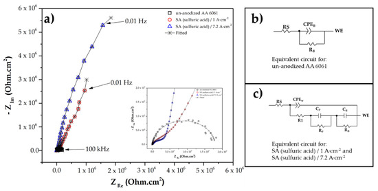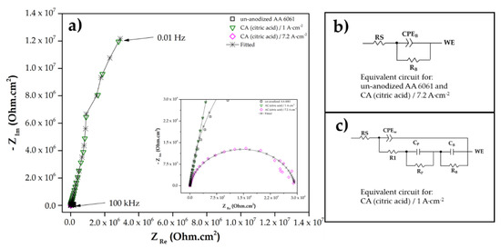 (a) Nyquist diagrams for the un-anodized AA 6061 and samples anodized in citric–sulfuric acid, evaluated in 3.5 wt.% NaCl solution; (b,c) equivalent circuits.
