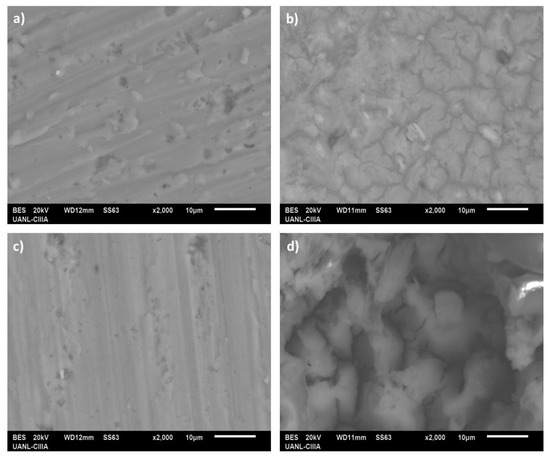 Figure 4 shows the surface morphology obtained by SEM in plan-view for samples anodized with (a) sulfuric acid solution and (b) a mixture of citric–sulfuric acid solution at two currents densities, i.e., 1 and 7.2 A·cm−2. As can be observed, irrespective of the anodizing solution used, the samples processed using a current density of 7.2 A·cm−2 presented porosity and superficial cracking (see Figure 4b,d). The anodized samples in both solutions with a current density of 1 A·cm−2, presented a more homogeneous (less superficial defects) and similar morphology (see Figure 4a,c). In fact, the CA (citric acid)/1 A·cm−2 sample shows a more regular and smoother surface than that for the SA (sulfuric acid)/1 A·cm−2 sample, which leads to a better corrosion resistance, since in this condition Cl− ions do not have an easy access path towards the barrier layer and the metallic substrate. For these conditions, the Rp and RB values from Table 4 confirm the above observations. On the other hand, the sample anodized with citric acid and a current density of 7.2 A·cm−2 presented the most defective and heterogeneous surface morphology under all conditions, giving the worst performance against corrosion. This type of structure was also observed in a previous study with a mixed tertiary acid anodization process [50]. Other authors have observed similar morphologies on the surface of anodized AA 1050 and AA 2024 T3 aluminum alloys in boric acid solutions [58].