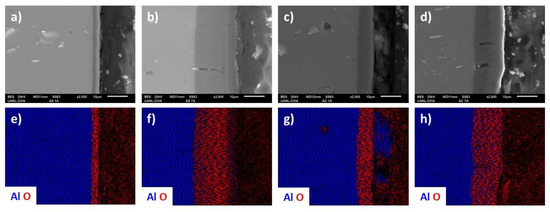 In Figure 6, the cross-section of the anodized AA 6061 alloy under different conditions and the element mapping performed by EDS is shown. The cross-section mapping of elements (Figure 6e–h), shows a higher concentration of oxygen (red) in the anodized layer formed in the anodizing solutions and different current densities, which confirms the formation of the anodized layer.