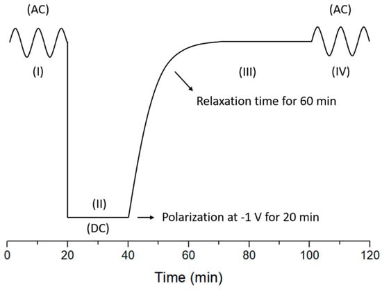 The corrosion protection performance was evaluated using an accelerated AC–DC–AC method [], whose cycles consisted of three steps, as shown in Figure 1: