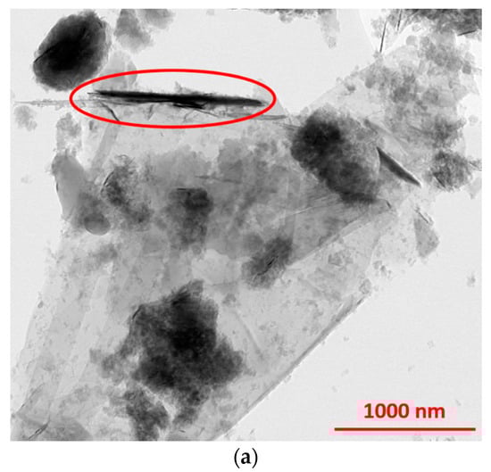 The reference image, obtained in Bright Field, clearly highlights the presence of a large flake, which appears grey in colour. The image also possesses some very dark areas, which denote accumulations of APTMS, as indicated by the Si element EDS map. The flake does not seem to present preferential grafting points, like the edges, but the silane probably reacted in areas with a greater presence of functional groups on the plane of the sheet. Moreover, the area circled in red in the reference image shows a flake positioned perpendicularly to the plane of the image. This assumption is confirmed by the carbon EDS map, which shows an intense signal. Moreover, the resolution of the equipment used in the analysis is equal to 0.16 nm, making it possible to observe even individual planes of graphene flakes. However, the signals of O and Si on that flake are interesting; these elements are co-located, detected on some spots of the surface of the sheet plane. The presence of oxygen is owing to the carboxylic, epoxy, and hydroxyl functional groups generated on the filler plane owing to the oxidation process, in addition to the silane alkoxy groups. In those precise points, however, the silicon signal is also observed, to represent the organisilane that has interacted with those functional groups.