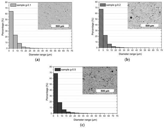 Dimensional distribution of the flakes inside the coatings, with relative stereomicroscope observation (in the inset). (a) sample g-0.1; (b) sample g-0.2; (c) sample g-0.5.