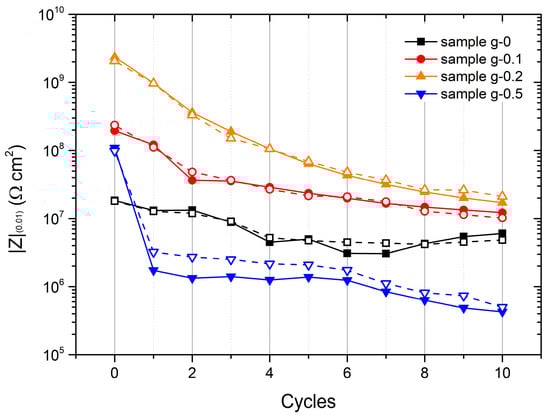 The coating free of fGO sheets shows an almost constant impedance modulus trend, with values near 107 Ω cm2. Because the initial impedance was relatively low, this sample was not particularly affected by delamination and development of corrosion products. In contrast, the samples g-0.1 and g-0.2 show evidence of the positive effect caused by the introduction of the fGO sheets in the acrylic matrix, with initial values of |Z|(0.01) higher than 108 and 109 Ω cm2, respectively. These two samples exhibited a slow decrease in the impedance modulus with increasing cycles. EIS measurements are very sensitive, and even a minimal defect or coating delamination can cause a significant decrease in |Z|(0.01). However, the low frequency impedances of these two samples were always higher than that of the g-0 layer, even in very aggressive conditions such as those simulated by the cathodic polarization cycles at −1 V. On the other hand, the agglomerations in sample g-0.5 caused a drastic drop in the impedance modulus after the first test cycle. Figure S1 (in Supplementary Data) highlights a marked drop in the impedance modulus and a corresponding phase shift towards higher frequencies during the first five test cycles.