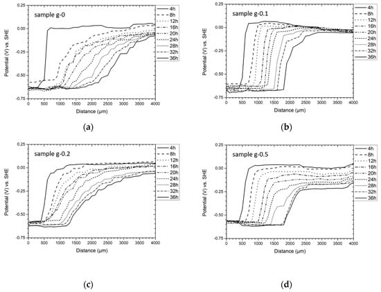 Scanning Kelvin probe (SKP) potential profiles of acrylic coated carbon steel sample with different amounts of fGO flakes measured with 3.5 wt.% NaCl solution as a function of time. SHE, standard hydrogen electrode. (a) sample g-0; (b) sample g-0.1; (c) sample g-0.2; (d) sample g-0.5.