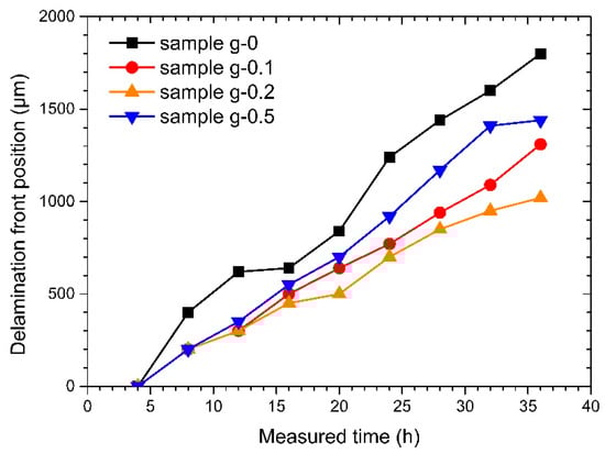 Delamination front positions of acrylic composite coated carbon steel samples with different fGO contents as a function of time, determined from the SKP potential profiles presented in Figure 6.