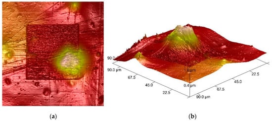 First of all, the behaviour of an fGO agglomerate was studied and compared to the performance of the acrylic matrix. As shown in Figure 8a, a scan of 50 μm by 50 μm was carried out near an accumulation of flakes using a set point voltage of 4 V, which represents a large interaction force. Subsequently, a larger area of 100 μm by 100 μm was scanned at set point equal to 0 V, to determine the depth of abrasion caused by the previous high force scan. The raised region that is lighter in color represents the region of a filler agglomerate, which does not seem to have been particularly affected by the 4 V set point scan based on the smooth profile of the topograhic mound in the scratched an unscratched region. In contrast, the polymer matrix, which is red in this image, exhibits a clear step at the end of the rastered area. This is also evident in the 3D image of Figure 8b.