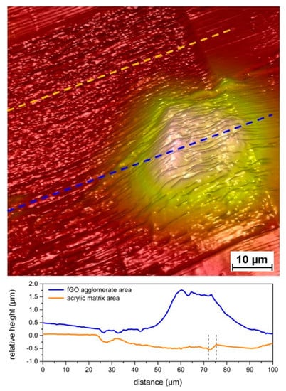 Quantitative assessment of the matrix and filler regions resulting from AFM scratching is provided in Figure 9. Again, a clear demarcation of the end of the area rastered with a high force is evident in the AFM topographic image. Linescans along the two dashed lines in the image are also provided in Figure 9. Because of the roughness of the rastered filler region, a clear step at the end of the region is not evident. However, careful analysis indicates a step in the matrix (without flakes) of about 0.3 µm at a location of about 75 µm in the profile. In contrast, the profile on the agglomeration does not show any step associated with the end of the rastered region. This first analysis confirms a notable response difference between acrylic matrix and graphene-based filler agglomerates during micro abrasion by AFM scratching. The removal of polymeric material is clear and evident, while the flakes’ accumulation does not seem to be affected by the passage of the AFM tip.