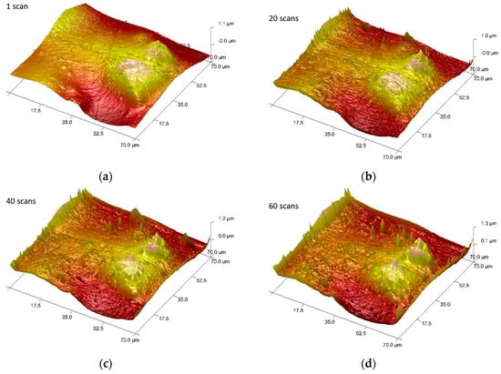 The acrylic matrix is easily degraded by the continuous passage of the abrasive tip. The morphology of the two accumulations also evolves over time, owing to the removal of the surrounding polymeric material. However, after 60 scans, high and defined peaks are still clearly visible, demonstrating the strong abrasion resistance of fGO agglomerations. This analysis is in accordance with what was previously shown in Figure 8 and Figure 9, confirming a clear difference in wear behavior of the agglomerated filler compared with the acrylic matrix. Unlike the polymeric material, the fGO agglomerations offer high resistance to removal by AFM scratching.