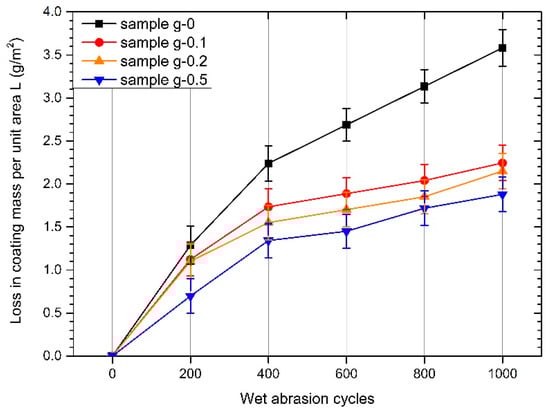 where m0 and mn are the sample’s initial weight and the weight after the nth cycle, respectively, while A represents the area traversed by the scrub pad over the coating’s surface. The trend of L can be used as a quantitative evaluation of the fGO concentration contribution to the abrasion of the composite coating. Figure 12 highlights the mass loss evolution as a function of the abrasion cycles number.