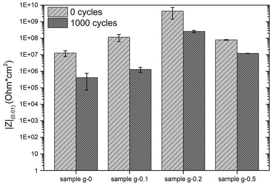 After 1000 abrasion cycles, the protective behavior of the coatings was assessed with EIS, and the results were compared with the measurements carried out before the scrub test. Figure 13 shows the variation of the Bode impedance modulus |Z|(0.01 Hz) before and after 1000 scrub abrasion cycles.