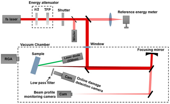During the experiments, the laser energy is monitored in the sample focal plane using a reference photodiode energy meter (PD 10-PJ-C, Ophir Optronics Solutions Ltd., Har Hotzvim, Jerusalem, Israel). The reference energy meter is calibrated with an energy meter (PE 25-C, Ophir Optronics Solutions Ltd., Har Hotzvim, Jerusalem, Israel) in the beam path of final optics to the sample before and after the measurements. As shown in Figure 2, the LIDT setup is enclosed in a vacuum chamber. The Residual Gas Analyzer (RGA) is mounted to the vacuum chamber to monitor the residual components. All the LIDT measurements were carried out in high vacuum ~10−6 mbar, at similar atmospheric conditions as the components that are used or going to be used in the facility.