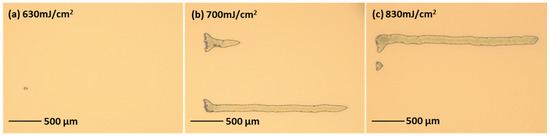 The typical surface damage morphologies from the Raster Scan method are shown in Figure 5 at various laser fluences. The full area of the scan is shown. As seen from the figure, we observed only the catastrophic-type damage. From Figure 5a–c, it is evident that the confinement of the damage is to the specific locations on the coating over large scanning areas represent the presence of coating defects in the sample. As the horizontal beam overlap is larger, the damage propagation can be seen in that direction. It is important to note that no visible defects/particles were observed on the sample surface before the measurements in the damage detection camera at a resolution of ~2.5 µm/pixel. The damage threshold found by this method is 0.6 J/cm2. This means no visible damage is observable under the Nomarski microscope.