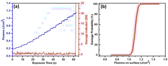 The typical evolution of the R-on-1 scan and damage probability are shown in Figure 6a,b respectively. From Figure 6a, it can be clearly visible that the laser fluence is increased in more than 20 steps and also sudden rise in damage indicator around the damage threshold. Although we see a catastrophic damage around the threshold for this sample, the threshold value for damage indicator was chosen ≥10 times the standard deviation of the scattering signal. The laser exposure is stopped to prevent the damage propagation/debris contamination above the damage indicator threshold value. The damage probability for each site was estimated from the threshold fluences of all sites (see Figure 6b). The total exposed number of sites are about to 30. The mean R-on-1 damage threshold fluence value of all the sites is found to be 1.1 J/cm2.