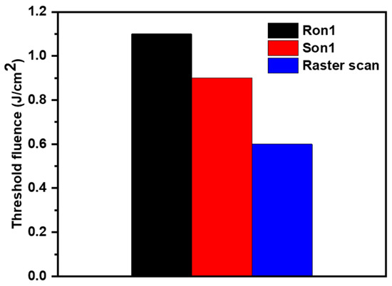In order to validate the critical mechanisms behind the failure of the coating, we compared the threshold values by different test methods on the sample surface in Figure 7. It is clear from Figure 7 that the R-on-1 method has a high threshold value (1.1 J/cm2) compared to the other two test methods S-on-1 (0.9 J/cm2) and Raster Scan (0.6 J/cm2). This is because of its exposure to a lower number of pulses at a given fluence during the ramping. The different damage threshold values based on the test method are linked to the various interrogation methods involved in each method. Interestingly, the damage threshold values of R-on-1 and S-on-1 at an equal number of pulses are found to be consistent. This also implies that there were no laser conditioning effects by fs laser irradiation. If we compare the threshold values from the Raster Scan and 100k-on-1 methods, the Raster Scan method resulted in a lower damage threshold. This lower threshold value and localized damage in Figure 5 are clear indications of possible defects/weaker areas of the coating.