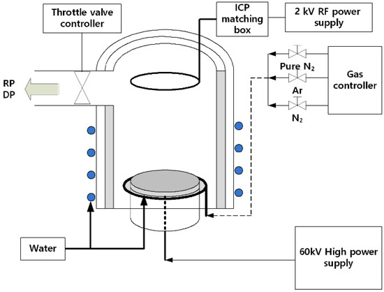 In this study, the effect of change in the bias voltages on the structural and electrochemical properties of 316L stainless steel was examined. The STS 316L stainless steel sheet with a thickness of 0.1 mm was used as the base material, and its chemical composition was presented in Table 1. Nitrogen ions were implanted using 60 kV PIII ion implantation equipment (KERI, Changwon, Korea). The vacuum chamber for the ion implantation equipment has a capacity of 100 L, which has a cylindrical shape with a diameter of 500 mm and a height of 510 mm. Besides, a high voltage power supply capable of applying up to 60 kV is connected to the specimen holder that mounts the substrate. Figure 1 shows the schematic illustration of plasma ion implantation equipment, and the experimental conditions for ion implantation are summarized in Table 2, respectively. The chamber was initially vacuumed and stabilized at 1.3 × 10−3 Pa. The specimen surface was then cleaned by plasma etching for 30 min at 0.66 Pa.