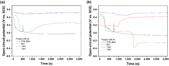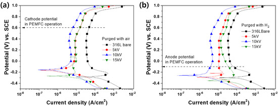 All the electrochemical analysis was performed in the cathodic and anodic conditions of PEMFC, as explained in the methods sections. The open-circuit potential (OCP) test was performed to investigate free corrosion potential until OCP reached equilibrium potential. In Figure 4, the 5 kV and 10 kV samples presented relatively higher potential, and no apparent potential drop was shown. In contrast, the bare and the 15 kV samples presented a sudden potential drop, which means they entered an activated state [21,22]. In particular, the 10 kV sample presented almost constant OCP during the test. This result implies that the 10 kV samples rapidly reach a steady-state with only small free corrosion in anodic conditions. Thus, the OCP test results suggest that applying lower bias voltages could enhance corrosion resistance in both cathodic and anodic conditions.