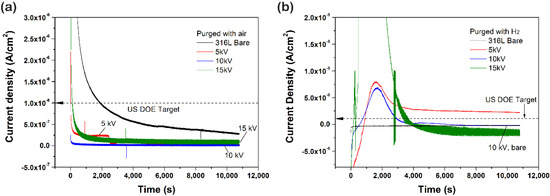 To investigate durability during the PEMFC operation, the potentiostatic polarization test was performed (Figure 6). As shown in the variation of current density in the cathode condition (Figure 5a), all of the samples showed a rapid current density drop. Then, they gradually stabilized to low current density with repetitive increasing and decreasing. A rapid current density drop might correspond to the formation of the passive film, which protects the surface from corrosion in the acidic environment [23]. Lower voltages of the 5 kV and the 10 kV samples maintained relatively constant current density, while the 15 kV sample presented a relatively high current density fluctuation. In comparison with the bare sample, the N+-implanted samples reached steady-state quickly due to a fully passivated surface. This result suggests that the N+ implantation at lower bias voltage induces the facile formation of the passive film. In the case of anode condition (Figure 6b), the current density of the N+-implanted samples gradually stabilized after switching from negative to positive and switching reversibly, which might have originated from the native passive film not being stable and quickly dissolving and then forming another passive film [23,24]. A small cathodic current implies the slow dissolution of the passive film and cathodic protection. Unlike the anode condition, the current switching from positive to negative was not observed in the cathode condition, because cathode potential (0.6 V) is located in the middle of the passivation region. As a result, the N+-implanted samples satisfied the target of the US department of energy (DOE) in the cathode condition, whereas, in the anode condition, only the 10 kV sample satisfied the DOE target. These differences will be discussed through phase examination.