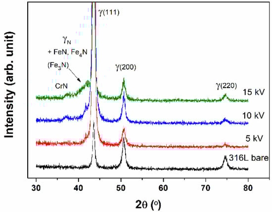 where D is the mean size of the ordered crystallite, K is a dimensionless shape factor, which usually equal to 1. λ is the X-ray wavelength, β is the line broadening at half the maximum intensity in radians, and is θ the Bragg angle. The new and small peak appeared at around 41.7°, and it is known as the nitrogen supersaturated phase, so-called expanded austenite (γN). The γN has an austenitic crystallographic structure (FCC), which is a nitrogen supersaturated metastable phase, and it has higher hardness and excellent corrosion and wear resistance [25,26,27,28,29]. Note that its broad peak width arises from high nitrogen concentration producing numbers of interplanar spacing in the whole of the implanted layer [30]. Meanwhile, the intensity of the γ (111) plane is increased as compared with the bare samples. This means that due to the N+ implantation, the number of (111) planes are arranged parallel with the surface, i.e., (111) plane becomes the strongly preferred orientation. This strongly preferred orientation effects on the corrosion resistance. Since the highest packing density of (111) plane in the FCC structure has stronger atomic bonding than (220) plane, it could inhibit atomic dissolution. Thus their corrosion resistance is enhanced by N+ implantation [31,32,33]. However, even though the 15 kV sample includes the γN phase with a strong preferred orientation for (111) plane, it presents different corrosion behavior with other samples. We assume that higher total nitrogen concentration induces the formation of excess nitride and CrN phase, resulting in a lack of chrome for maintaining corrosion resistance.