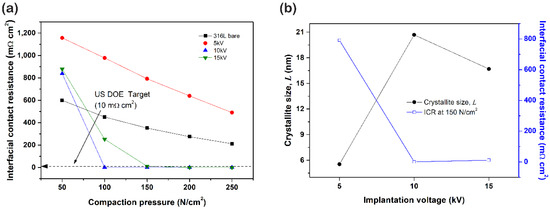 The generated electricity during the PEMFC operation was provided via the bipolar plate that contacted with the electrode. Thus, lower interfacial contact resistance (ICR) is required for enhancing cell efficiency. The ICR between sample and carbon paper at the various compactions were examined. Generally, the bipolar plate is compacted at 150 N/cm2. Thus, the ICR value that conducted at the 150 N/cm2 is used for investigating the relationship between several factors. As can be seen in Figure 8, the 5 kV sample presents the highest resistivity, and its ICR value exhibits a huge difference compared to other samples. As a result, the 10 kV sample presented the lowest ICR at 150 N/cm2, and their values were as follows; 10 kV (0.7 mΩ∙cm2) < 15 kV (11.5 mΩ∙cm2) < 5 kV (791.5 mΩ∙cm2). In Figure 8b, the ICR tended to decrease as the crystallite size increased. Generally, electron scattering is generated from grain boundaries, wherefore an increase in the number of grain boundaries leads to a higher degree of electron scattering. In addition, the decrease in crystallite size gives rise to grain boundaries. Subsequently, increased electron scattering leads to an increase in electric resistivity [34]. Therefore, we assume this big difference in ICR might arise from the crystallite size. The 10 kV sample has the biggest crystallite size because the increase in the implanted nitrogen concentration leads to expanding lattices. However, when ion concentration reaches a critical point, increased plastic deformation induces the excessive formation of nitride, including CrN. On this occasion, a formation of the CrN phase accompanies the decomposition of the γN phase. Consequently, the crystallite size of the 15 kV sample becomes smaller than the 10 kV sample.